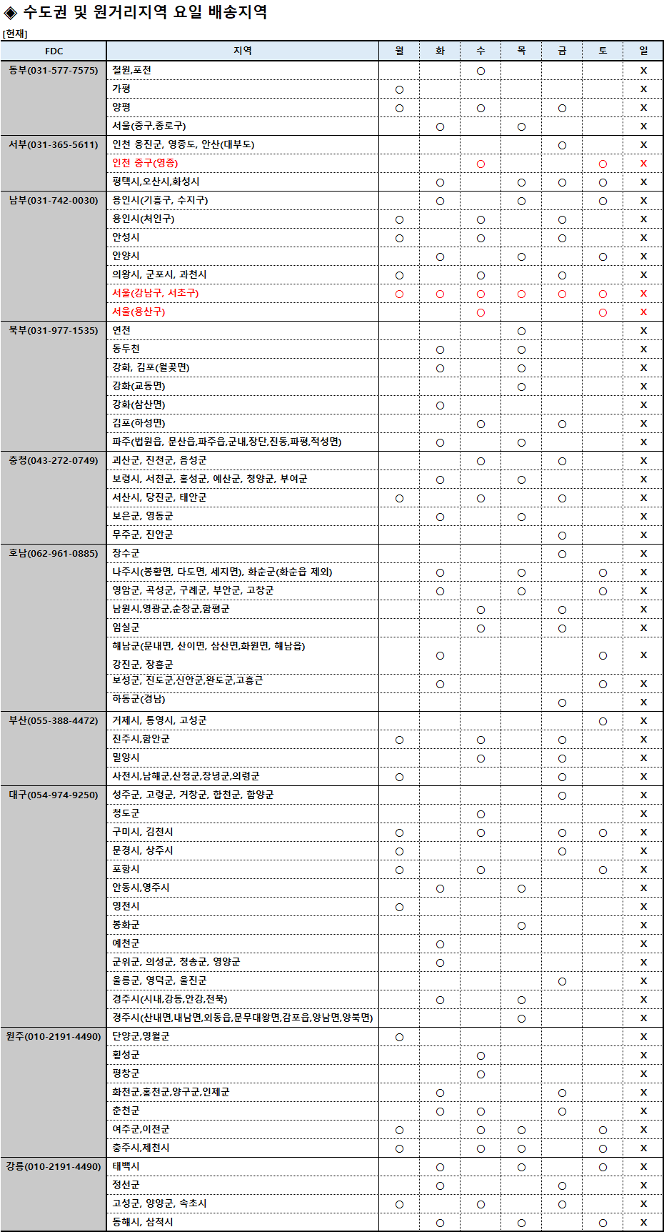 [26.03.25~] 요일 배송지역 공지
